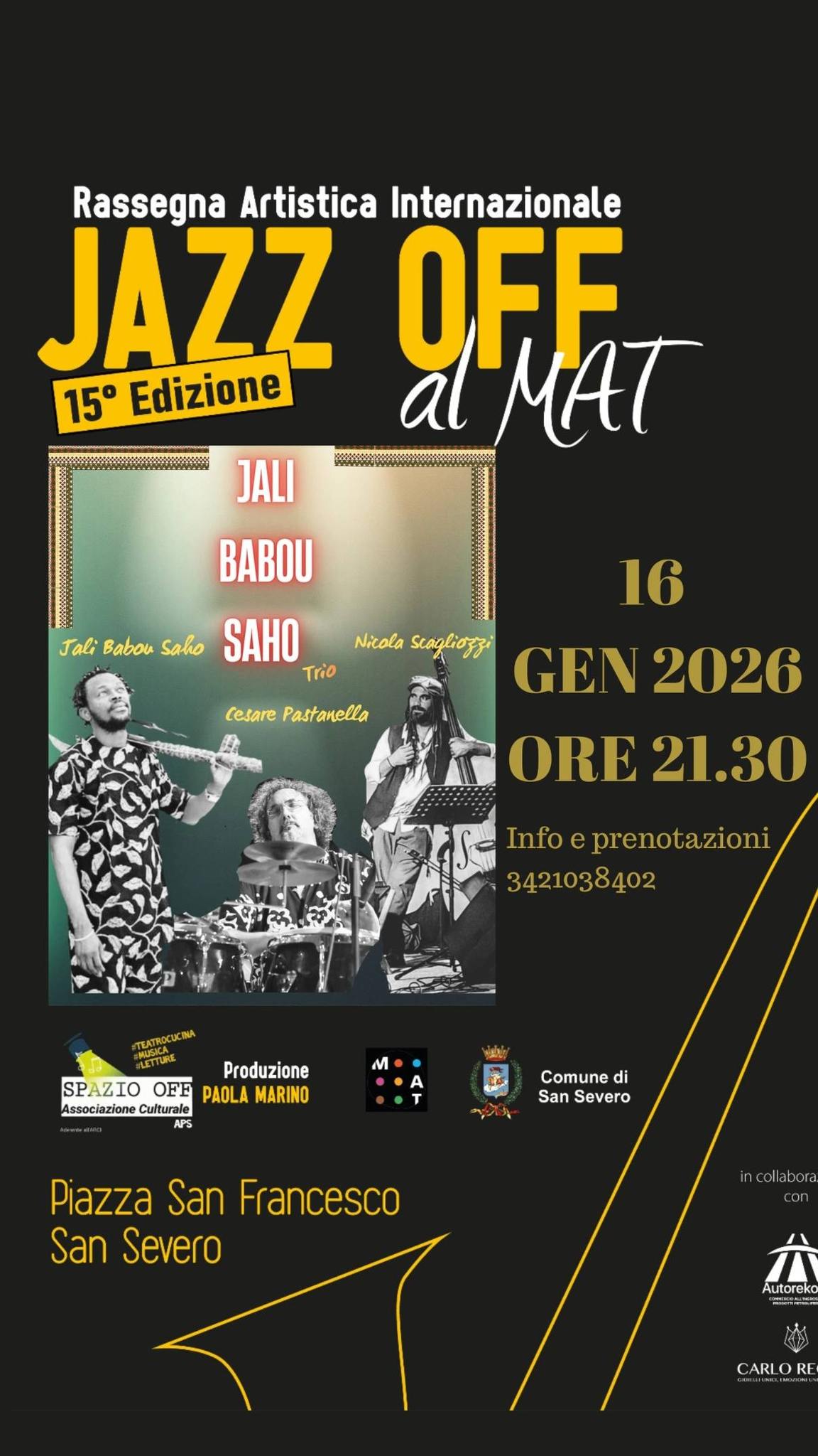 La grande musica internazionale torna protagonista a San Severo con la 15ª edizione di Jazz Off, la rassegna artistica che da anni porta l'eccellenza del genere nel cuore della città. Venerdì 16 gennaio, presso il MAT (Museo dell’Alto Tavoliere) in Piazza San Francesco, sarà la volta del Jali Babou Saho Trio. La kermesse è dedicata a Teo Ciavarella.
