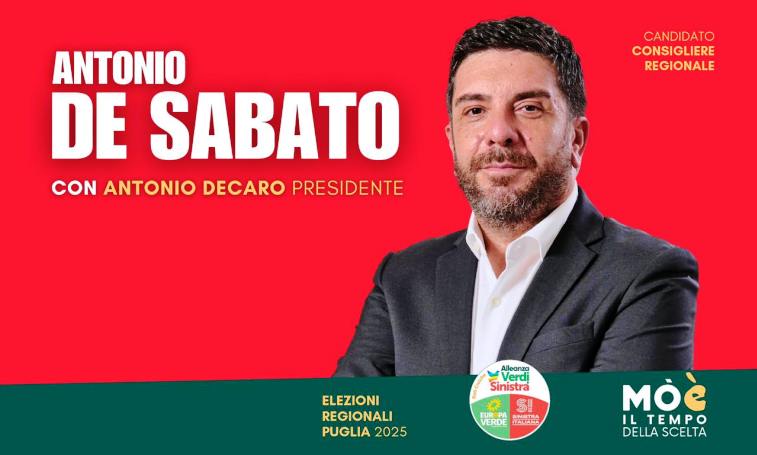 Antonio De Sabato, consigliere comunale di Foggia e vicepresidente della Commissione Cultura, annuncia ufficialmente la sua candidatura al Consiglio Regionale della Puglia nella lista Alleanza Verdi e Sinistra, a sostegno di Antonio Decaro Presidente.