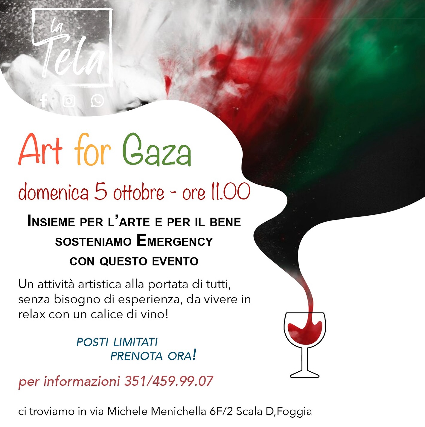Un momento di creatività e condivisione, il cui ricavato sarà interamente devoluto in beneficenza a sostegno delle iniziative di Emergency contro la Guerra. E' "Art for Gaza", in programma domenica 5 ottobre alle 11 presso "La Tela", associazione di arti visive in via Menichella a 6/F2 scala D a Foggia.