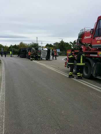 Si è ribaltata intorno a mezzogiorno, forse a causa del terreno viscido, su via Castiglione/Ss 673, allo svincolo con la circonvallazione.