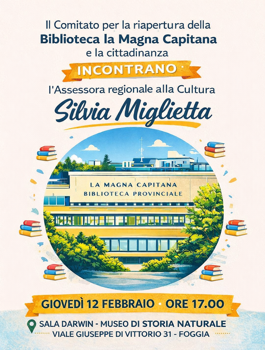 Un primo importante obiettivo raggiunto: per la prima volta si terrà a Foggia un incontro pubblico dedicato alla riapertura della Biblioteca “la Magna Capitana”, nel corso del quale sarà presentato il cronoprogramma dei lavori. E il Comitato per la riapertura della Biblioteca “la Magna Capitana”, che tanto si sta spendendo, "accoglie con soddisfazione la risposta dell’Assessora regionale alla Cultura, Silvia Miglietta, alla lettera aperta diffusa nei giorni scorsi".