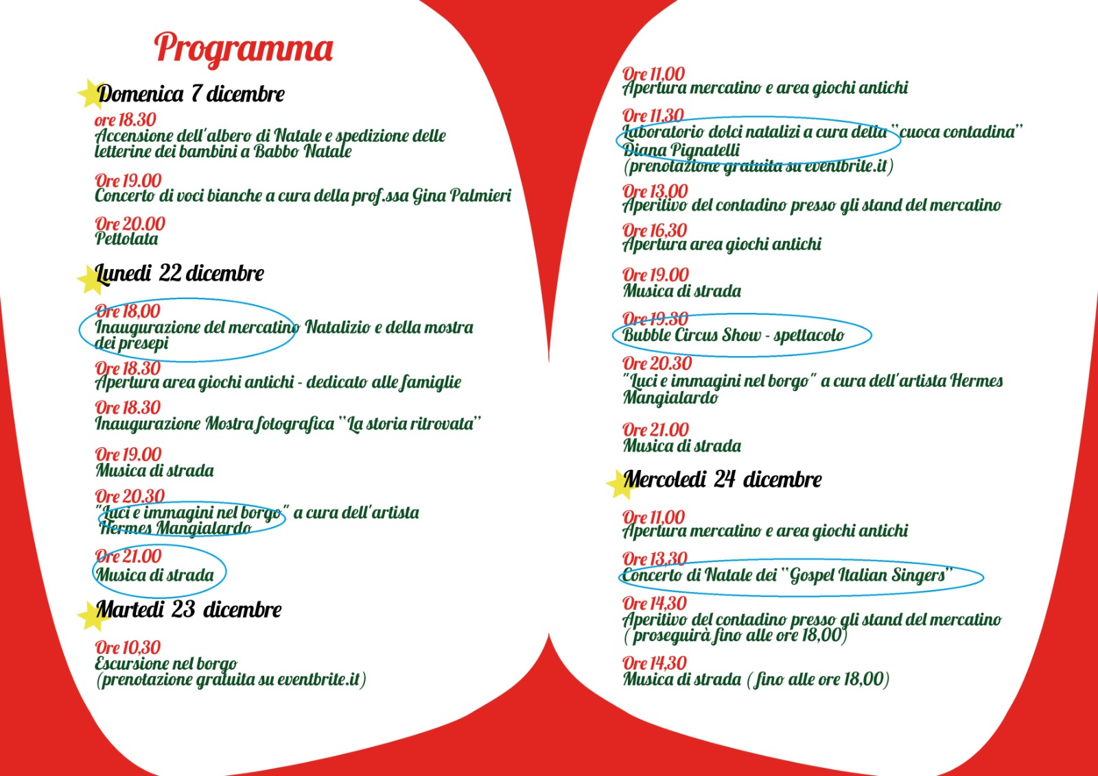 BORGO INCORONATA. Il programma del ‘Natale al Borgo’ Incoronata, allestito invece dall’assessorato alle Attività produttive, dopo l’apertura di domenica 7 dicembre proseguirà da lunedì 22 a mercoledì 24 dicembre, con giochi antichi dedicati alle famiglie, la mostra fotografica ‘La storia ritrovata’, musica di strada, escursioni, spettacoli (come il Bubble Circus Show martedì 23 dicembre), laboratori di dolci, l’allestimento del mercatino e aperitivi.