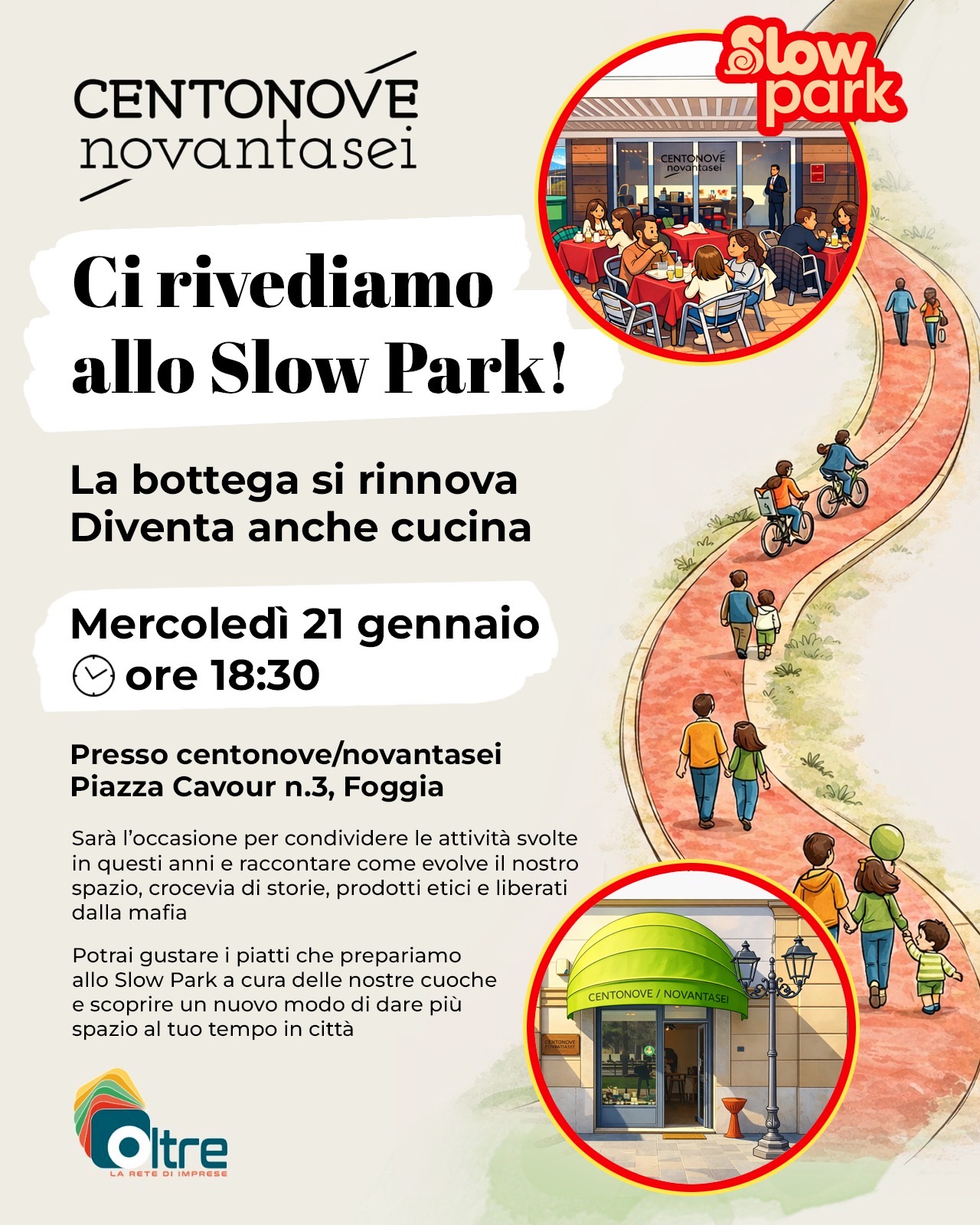 LA CUCINA. Nel corso dell’incontro sarà possibile assaggiare anche alcuni piatti che vengono già preparati allo Slow Park a cura delle cuoche di centonove/novantasei, un avamposto di cultura e sapori che sin dal nome vuole raccontare l’efficacia della legge 109/96, la normativa che consente la restituzione alla collettività delle ricchezze e dei patrimoni sottratti alle organizzazioni criminali favorendone il riutilizzo pubblico e sociale. Anche per questo, sarà presente Anna Cavallone in rappresentanza di Libera Foggia per riflettere e ribadire l’importanza di questa legge che attraverso la confisca di beni, terreni, immobili genera un cambiamento delle persone e dei territori coinvolti, favorendo anche l’inserimento lavorativo di quanti provengono da situazioni di fragilità. “centonove/novantasei – cucina e bottega” continuerà a raccontare tutto questo anche nei locali dello Slow Park attraverso la varietà dei prodotti presenti sugli scaffali, nei piatti da gustare, nei menù e con un programma di eventi che mira a far conoscere testimonianze, buone prassi, economie sostenibili e circolari, per avviare un processo di riflessione e di contaminazione positiva nelle nostre comunità.