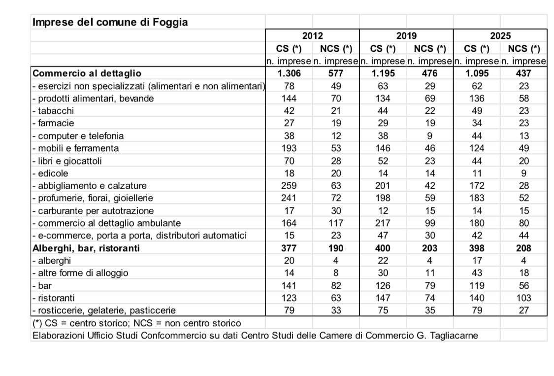 Una dinamica che trova riscontro anche a livello locale. I dati sulla demografia d’impresa del Comune di Foggia mostrano infatti un progressivo ridimensionamento del commercio al dettaglio nel centro storico negli ultimi anni, accompagnato da una crescita delle attività legate alla ristorazione, all’ospitalità e ai servizi. Una trasformazione che riflette i cambiamenti nei modelli di consumo ma che pone anche il tema della tenuta economica e sociale delle vie commerciali urbane.