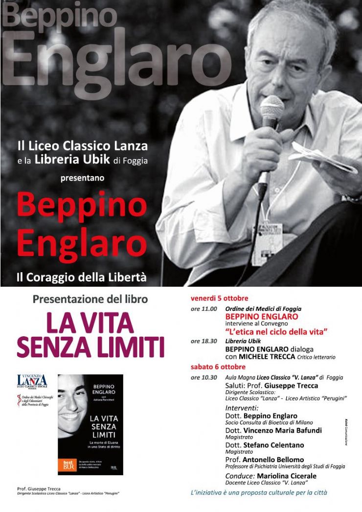 TRE APPUNTAMENTI IN DUE GIORNI. Beppino Englaro a Foggia, venerdì 5 e sabato 6 ottobre, grazie al lavoro congiunto della libreria Ubik, dell’Ordine dei Medici e degli Odontoiatrici e del Liceo V. Lanza. Tre incontri importanti, aperti alla città, concentrati in due giorni, con inizio previsto per la mattina di venerdì, a via Acquaviva 48, intorno alle 11.30, sede dell’Ordine dei Medici, per poi spostarsi in serata nel consueto salotto letterario della libreria di Piazza U. Giordano, alle ore 19. Raccontare, spiegare, rivivere una vicenda che, da sempre, divide e appassiona l’opinione pubblica, chiamata a riflettere sul tema più importante di sempre: la vita. E interessante sarà vedere anche la reazione delle giovani generazioni, gli allievi del Liceo V. Lanza, il pubblico scelto per l’incontro di sabato 6 ottobre, alle ore 10.30.