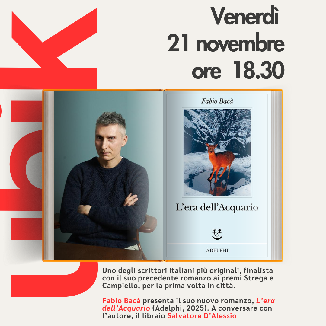 TRA SOCIAL E VIRTUOSISMO. La luce abbagliante e spesso bugiarda dei social, la penombra dei nostri dubbi più intimi, nel nuovo, turbinoso romanzo di Fabio Bacà, il quale racconta – anche, ma non solo – di Chloe, sex influencer con profilo su Only Fans. Venerdì 21 novembre, alle ore 18.30, l’autore marchigiano, considerato uno degli scrittori più virtuosi e originali del panorama italiano, incontra per la prima volta il pubblico di Foggia, super ospite alla Ubik in occasione dei suoi diciotto anni. Fabio Bacà presenta il suo nuovissimo romanzo dal titolo “L’era dell’Acquario” (Adelphi, 2025), chiamato a conversare con il libraio Salvatore D’Alessio.