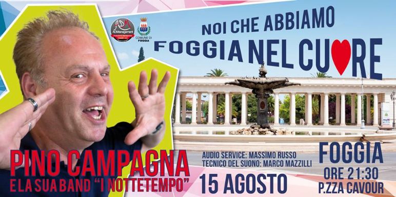 L'evento clou del cartellone estivo 2013 realizzato dal Comune di Foggia è lo spettacolo “NOI CHE ABBIAMO FOGGIA NEL CUORE” di Pino Campagna e i Notte Tempo che si terrà il 15 agosto in Piazza Cavour con inizio previsto alle 21,30.