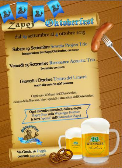 La Baviera, i suoi colori, i sapori e, soprattutto, la sua birra, nuovamente nella periferia di Foggia. Dopo il successo dell’edizione 2014, da sabato 19 settembre fino a domenica 4 ottobre ritorna l’Oktoberfest Zapoj, al risto-pub di Via Grecia 36 (“Macchia Gialla”). Musica dal vivo, teatro alla carta, birre speciali, happy night e Menu Bavarese tutte le sere, per festeggiare la ricorrenza tanto cara ai tedeschi sia dentro che fuori, all’aperto, nel Garden Zapoj. Di scena, unicamente per queste due settimane, la birra Wieninger Festbier: la versione Oktoberfest in edizione limitata della “spina” artigianale di Teisendorf, nella regione del Berchtesgaden, Germania, dal 1813 prodotta dalla famiglia Wieninger. Si comincia sabato 19 settembre, ore 22: inaugurazione Oktoberfest Zapoj affidata alla musica dei Sowelu Project. A seguire, venerdì 25 settembre (ore 22), spazio ai Resonance Acoustic Trio. Giovedì 1° ottobre, ore 21.30, torna invece il teatro alla carta a cura della compagnia Teatro dei Limoni, questa volta in pieno “stile bavarese”. E ogni martedì e mercoledì, “Happy Beer” sulla Wieninger Festbier: prendi due, paghi una.