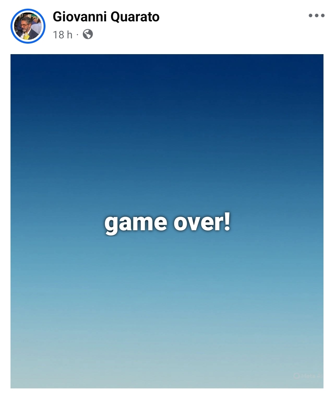 QUARRATO. In serata un altro chiaro segnale delle difficoltà il Campo Largo, il consigliere comunale Giovanni Quarato ha scritto sulla sua pagina facebook “Game Over”, senza però aggiungere altre spiegazioni alle richieste arrivate nei commenti.