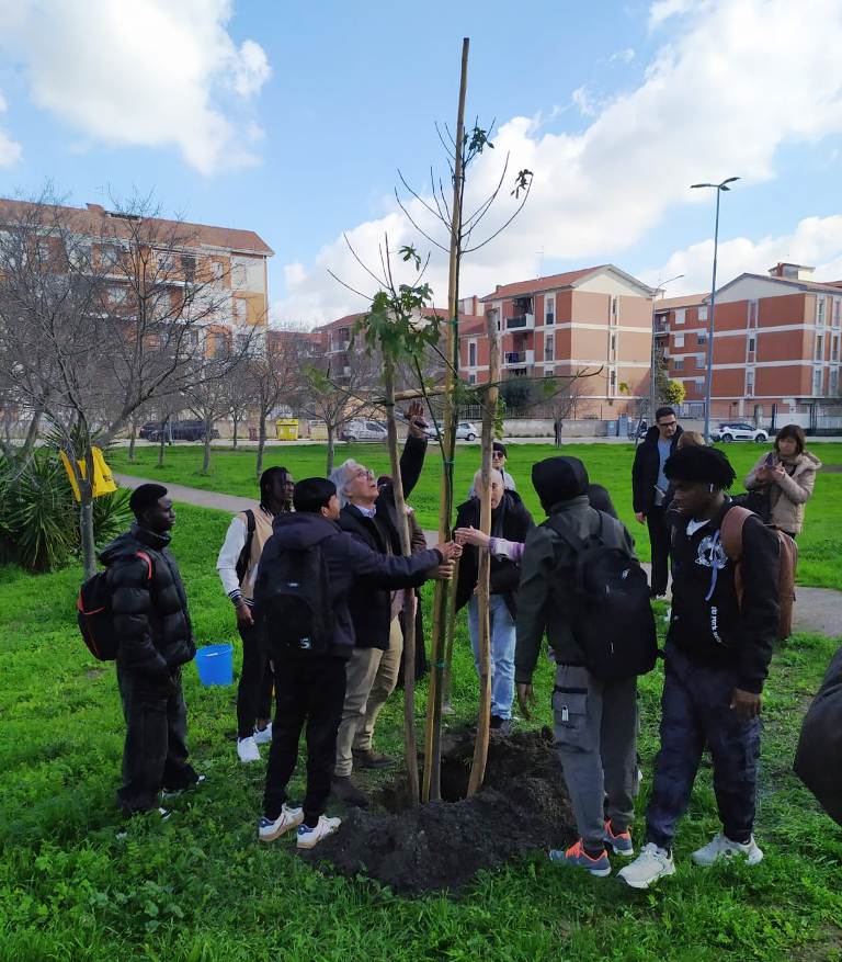 LA BIODIVERSITA'. "L’obiettivo centrale dell’iniziativa - spiegano da Legambiente - è la tutela della biodiversità, attraverso azioni concrete di riforestazione e salvaguardia degli ecosistemi urbani. Sono stati piantumati due alberi di tre metri Brachychiton acerifolius, conosciuti anche come Flame Tree o Alberi Fiamma. Piantare un albero significa prendersi cura del pianeta: gli alberi svolgono un ruolo insostituibile nella lotta alla crisi climatica, contribuiscono alla qualità dell’aria, regolano il microclima e arricchiscono la biodiversità urbana. In città, inoltre, mitigano gli effetti del degrado e dell’inquinamento, migliorano il paesaggio e favoriscono comportamenti più responsabili nei confronti dell’ambiente. Questa iniziativa ha rappresentato anche un’occasione per promuovere un momento di cittadinanza attiva sul tema dei cambiamenti climatici, coinvolgendo l’intera comunità in un gesto collettivo di cura del territorio. Il progetto rientra nelle attività condivise tra Legambiente , Coop Alleanza 3.0 e la scuola, impegnate nella realizzazione di interventi di riforestazione e nella creazione di nuovi spazi verdi resilienti. Al centro di questo impegno c’è una visione chiara: trasformare ogni area verde in un motore di biodiversità, progettando comunità vegetali capaci di durare nel tempo e di rafforzare la resilienza degli ecosistemi urbani".