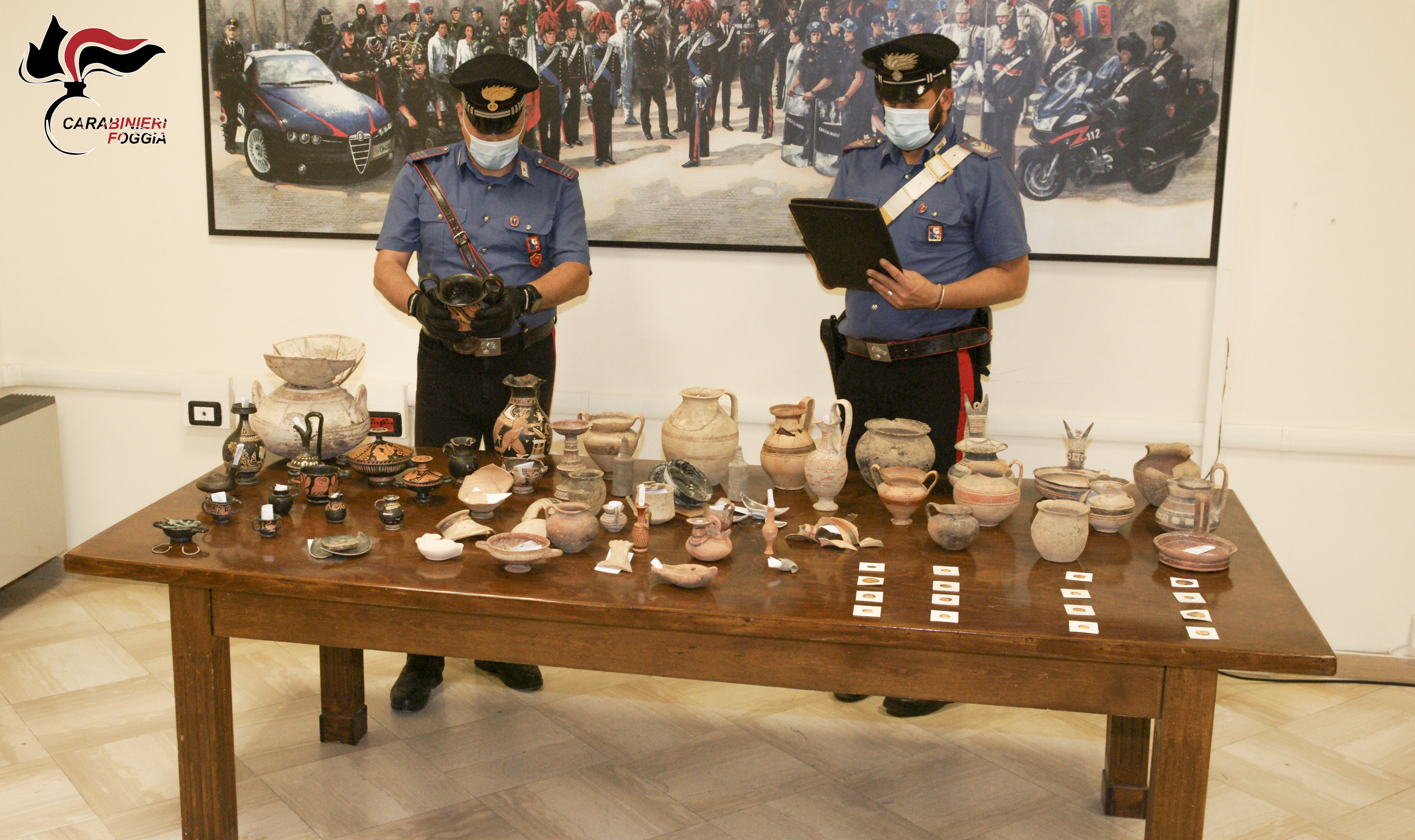 I Carabinieri della Sezione Operativa della Compagnia di Foggia, coadiuvati dalle “gazzelle” del 112 hanno effettuato una perquisizione domiciliare in un immobile nel quartiere “Ferrovia” e hanno rinvenuto 54 reperti archeologici, risalenti presumibilmente al periodo tra il VI e III secolo a.C. del valore complessivo di circa 15mila euro. Un “tesoro” consistente in olle, brocche e piccoli vasi in terracotta oltre a 15 monete e una medaglia d’oro risalenti al periodo tra il IV secolo a.C. e il XX secolo, per un valore complessivo che oscilla tra i 5000 e gli 8000 euro.