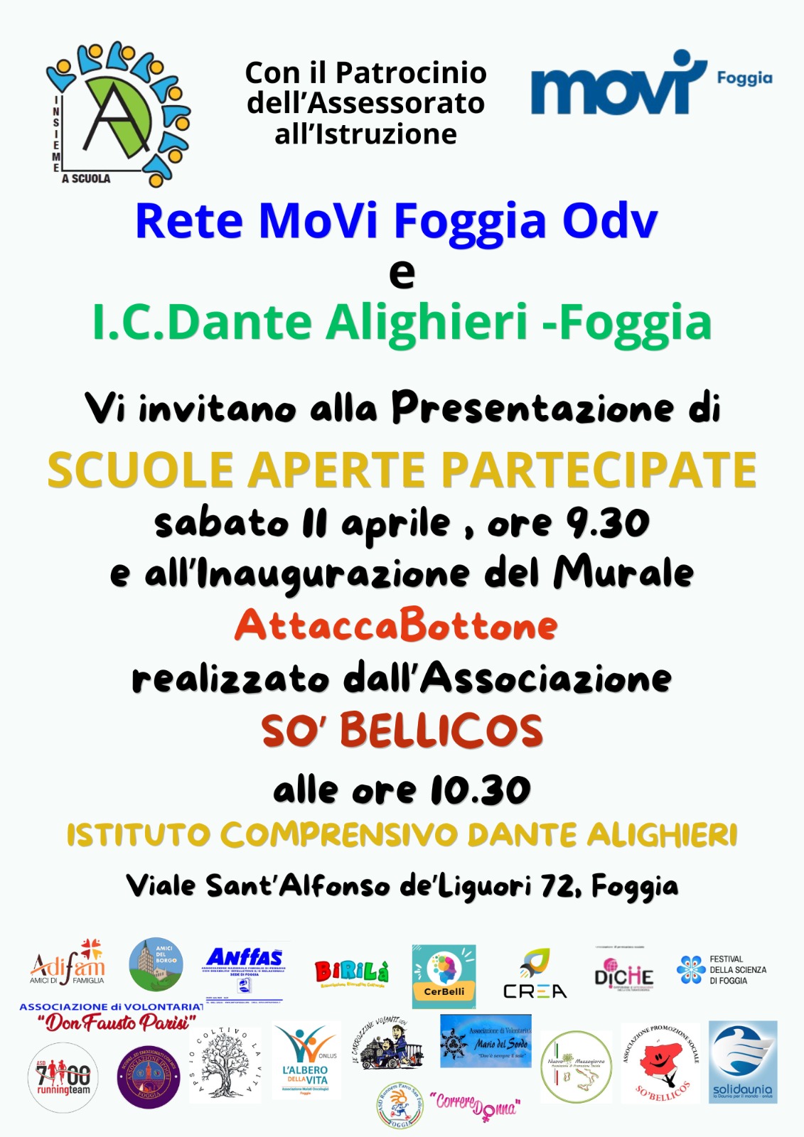 ARTE E COMUNITA'. Dopo la presentazione del progetto, alle ore 10:30, seguirà un momento di grande impatto visivo e simbolico: l’inaugurazione del murale “AttaccaBottone”. L’opera, realizzata dall’Associazione So’Bellicos insieme agli studenti durante un laboratorio di riciclo creativo, rappresenta non solo un elemento decorativo, ma anche il simbolo concreto di come sostenibilità e arte possano diventare strumenti di cittadinanza attiva e partecipazione. “Vogliamo una scuola che non chiuda mai le porte al futuro – spiegano le associazioni della Rete MoVi di Foggia – un luogo dove la comunità educante possa ritrovarsi e crescere insieme”. L’appuntamento è aperto a tutti, con l’invito a partecipare per sostenere un’idea di scuola che sia, prima di tutto, casa della comunità.