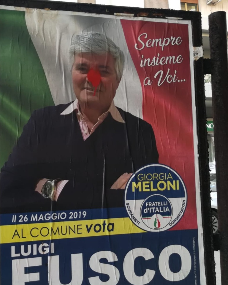 In questi giorni in Via Bari, ma anche in altre zone di Foggia, qualcuno ha disegnato un pallino rosso sul naso dei manifesti dei volti dei candidati alle elezioni comunali del 26 maggio.
