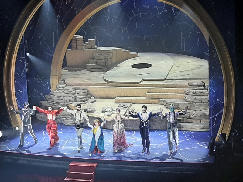 IL PICCOLO PRINCIPE. Lo spettacolo motore del viaggio è stato lo show Il piccolo principe, per la regia di Stefano Genovese. Questa rappresentazione si snoda lungo diversi registri teatrali: un po' prosa, un po' musical, un po' spettacolo circense, un po' installazione, tutti i “quadri” che riportano il viaggio del Picccolo Principe tra i pianeti e gli incontri che compie lungo il percorso, sono un caleidoscopio di colori, ancorati a scelte musicali indovinate, popolari ed evocative. La narrazione si apre con le note di Life on Mars, di David Bowie, che accompagnano il volo dell'aviatore prima dell'avaria che lo costringe all'atterraggio di fortuna nel deserto in cui incontrerà il piccolo principe. Sempre Bowie, con Starman, l'intermezzo che segna lo stacco da un “quadro” all'altro. La scenografia si sviluppa in verticale, con il secondo piano versatile che diviene di volta in volta il giardino in cui cresce la rosa, il firmamento dell'uomo che conta le stelle, il pianeta del geografo o il baratro in cui cade l'ubriacone, e leggiadri, coloratissimi palloni che appaiono e scompaiono nella volta del cielo, corpi celesti del sistema solare attraversato dal protagonista. Le performance, della cantante che interpreta la rosa, degli attori (alcuni di loro impersonano più ruoli) e degli acrobati esprimono pienezza e talento. L'uomo che conta le stelle, in movimento sulle scale a pioli che fa giostrare come un giocoliere le biglie, o l'ubriacone, che realizza uno splendido spettacolo con il trampolino, o il lampionaio e la sua abilità con la pertica, sono un innesto del circo che regala suggestioni a uno spettacolo di impatto immediato e coinvolgente. La tenerezza dell'incontro tra il Piccolo Principe e la Volpe è sottolineata dal brano La Cura, di Franco Battiato, mentre il commiato del protagonista si svolge lasciando veicolare l'emozione del distacco a The sound of silence.
