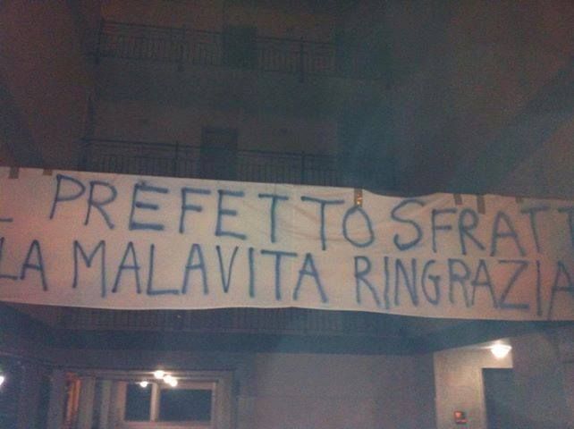 'Il Prefetto sfratta. La malavita ringrazia'. E' la scritta contenuta nel manifesto apparso tra i palazzi cui proprietari sono a rischio sfratto. Si tratta delle oltre 80 famiglie famiglie riunite nell'associazione 'Assegnatari Alloggi Legge Gozzini', tra le quali c’è anche la vedova di un sovrintendente di polizia, che hanno ricevuto lo sfratto esecutivo dall’ufficio casa della Prefettura. L'esecuzione avrà inizio dal 1 ottobre.