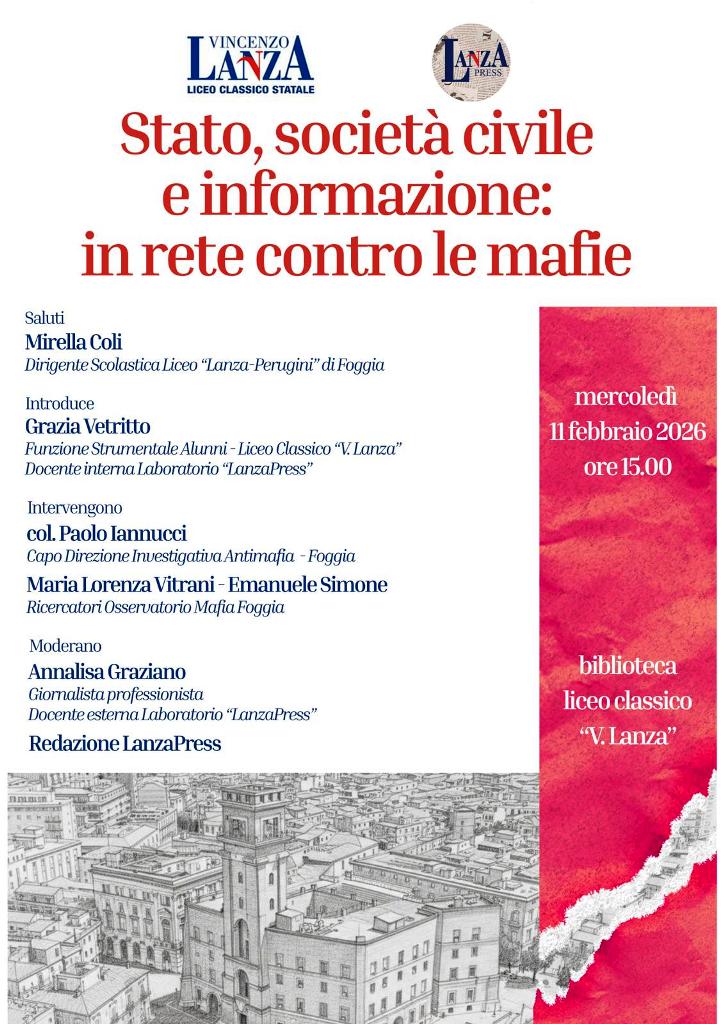 Mercoledì 11 febbraio 2026, alle ore 15.00, nella biblioteca del Liceo classico Vincenzo Lanza di Foggia, ci sarà l’incontro “Stato, società civile e informazione: in rete contro le mafie”, un appuntamento di approfondimento e confronto dedicato al ruolo delle istituzioni, della società civile e dell’informazione nella lotta ai fenomeni mafiosi, con un’attenzione particolare al valore educativo della conoscenza e della partecipazione consapevole.