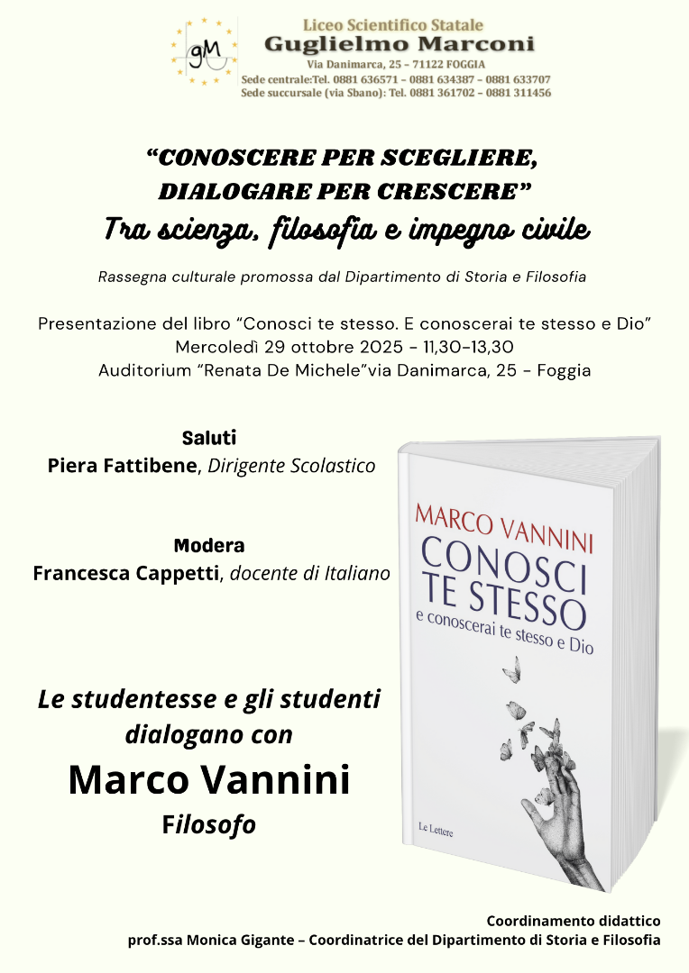 La cultura è un cammino condiviso. Solo incontrando il pensiero dell’altro, infatti, si impara davvero a pensare. Con questa convinzione il Liceo Scientifico “G. Marconi” di Foggia inaugura la rassegna culturale “Conoscere per scegliere, dialogare per crescere”, promossa dal Dipartimento di Storia e Filosofia, coordinato dalla prof.ssa Monica Gigante. L’iniziativa nasce con l’obiettivo di offrire alle studentesse e agli studenti occasioni di dialogo diretto con autori e pensatori contemporanei, per coltivare una formazione capace di tenere insieme rigore razionale e profondità umana.