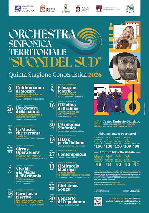 Una sinfonia di emozioni lunga un anno che porta a Foggia il respiro della grande musica, tra capolavori assoluti e nuove contaminazioni. L’Orchestra Sinfonica Territoriale “Suoni del Sud” ha presentato la sua Quinta Stagione concertistica con un cartellone di quattordici appuntamenti che confermano il Teatro Giordano come uno dei centri musicali più vivaci del Mezzogiorno, tra grandi interpreti internazionali, produzioni originali e dialoghi tra generi (e questo malgrado la capienza ridotta di questi ultimi mesi).