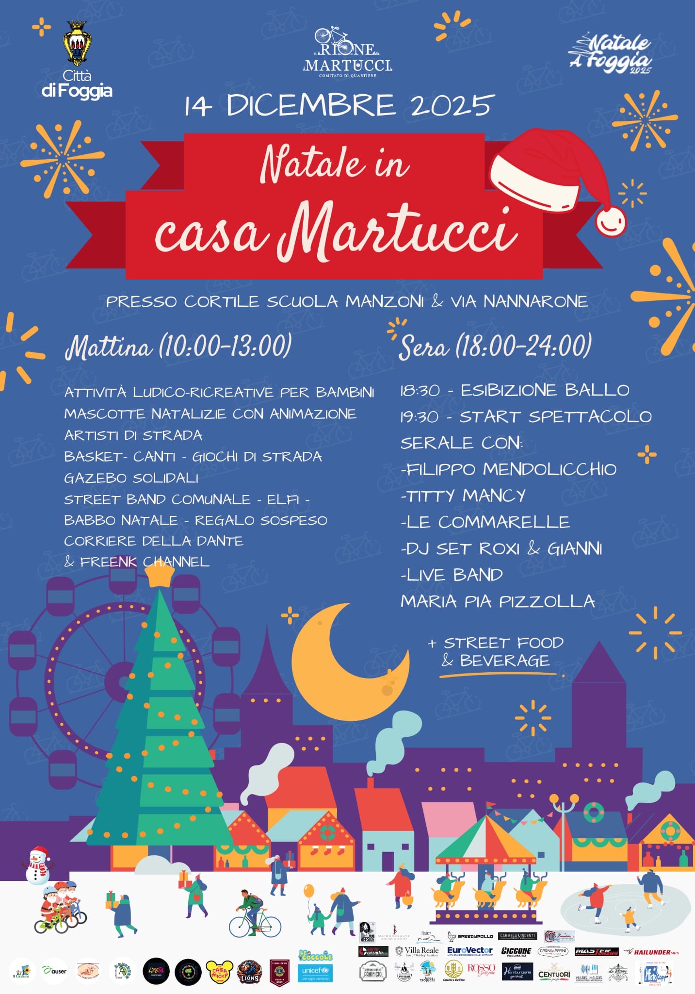 Il Comitato di Quartiere “Rione Martucci” promuove la prima Festa Natalizia del Rione, in programma domenica prossima 14 dicembre dalle ore 10 alle ore 13 e dalle ore 18 alle ore 24 presso il Circolo Didattico Manzoni e lungo Via Nannarone.