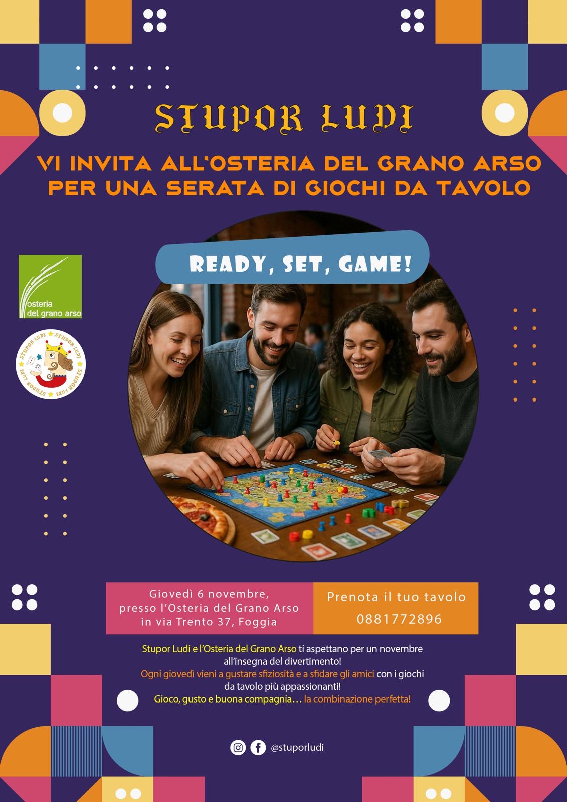 All’Osteria del Grano Arso di Foggia nasce un nuovo appuntamento dedicato alla cultura del gioco e alla convivialità. A partire da novembre 2025, ogni giovedì sera il locale in via Trento 37 a Foggia ospiterà gli “incontri ludici”, organizzati in collaborazione con l’associazione culturale “Stupor Ludi”.