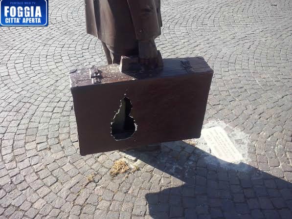 Un bicchiere di plastica, un biglietto del treno e, nei giorni scorsi, anche dei fogli e delle buste. La valigia del ‘Viaggiatore’, la statua che campeggia nel piazzale antistante la stazione, rischia di trasformarsi in un cestino di rifiuti. Lo squarcio alla valigia si fa sempre più significativo ed è ormai ricettacolo di oggetti vari (LEGGI E GUARDA FOTO: Il viaggiatore con la valigia rotta: danni alla statua nel piazzale della stazione)