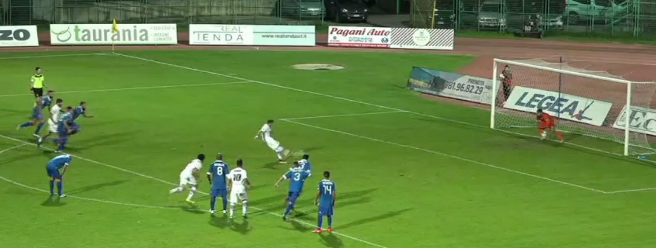 SALVA ANGELO. Ottima ripartenza della Paganese, pallone sulla sinistra per Cicerelli che può entrare in area e calciare, il brasiliano in spaccata devia in angolo.
