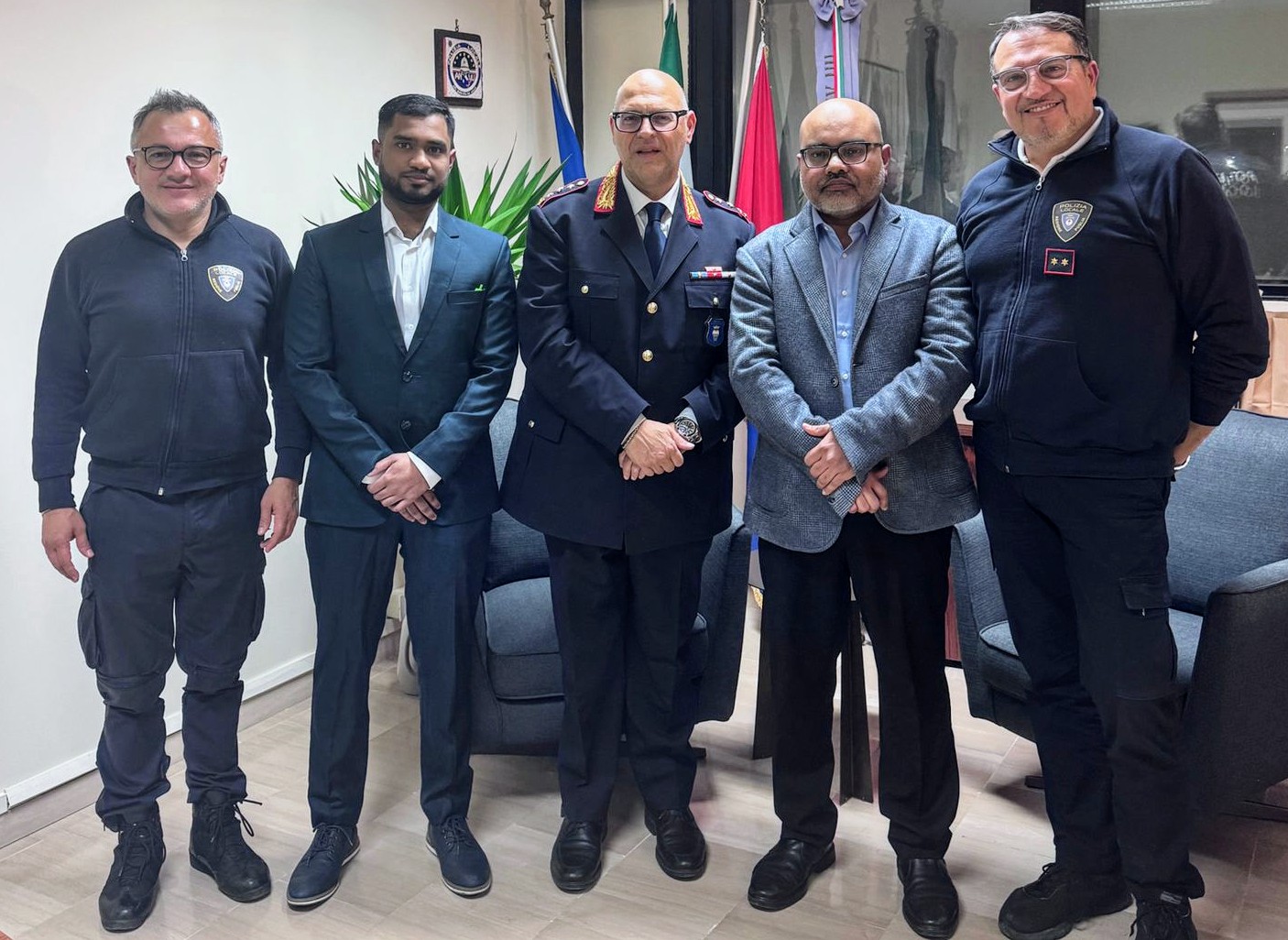 LA COLLABORAZIONE. Il comandante Manzo ha accolto con interesse la proposta del CCIFB, assicurando che adotterà le misure necessarie per sostenerla. All'incontro hanno partecipato anche i commissari della polizia locale Domenico Affatato e Valeriano Di Bitonto. La delegazione del CCIFB era formata dal segretario amministrativo e portavoce Mainul Islam e dal membro del comitato direttivo Sazzad Hossain.
