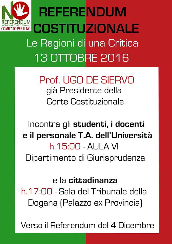 Giovedì 13 ottobre il Comitato provinciale per il NO al referendum costituzionale organizza due incontri con il Prof. Ugo De Siervo, ex Presidente della Corte Costituzionale.