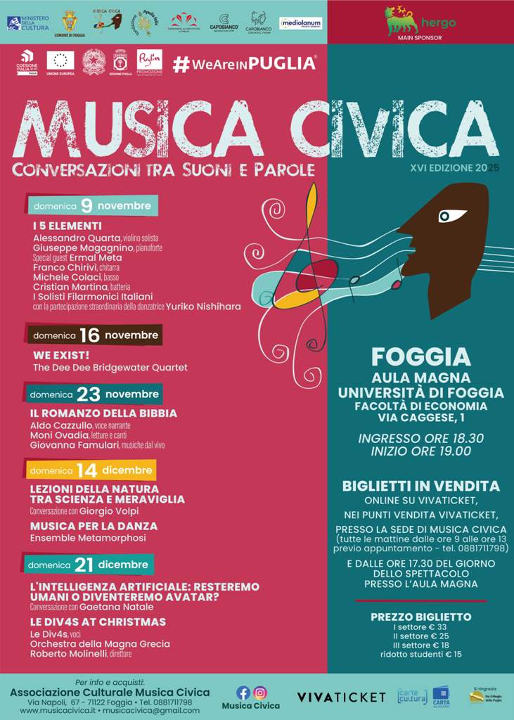INFO. Da oggi in vendita i biglietti per lo spettacolo del 9 novembre e da sabato i biglietti per gli spettacoli seguenti. Gli spettacoli sono già tutti in vendita presso la sede dell’Associazione Musica Civica (via Napoli, 65 – Foggia) previo appuntamento telefonico allo 0881.711798 tutti i giorni feriali dalle 9 alle 13 o presso il botteghino dell’Aula Magna (Via Caggese, 1 – Foggia) dalle ore 17.30 del giorno dei concerti. Ingresso pubblico ore 18.30 – spettacoli ore 19.00.