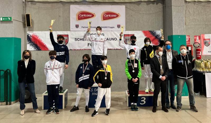 SCIABOLA. Fra i Maschietti vince Simone De Rosa del Circolo Schermistico Dauno che supera in finale col punteggio di 10-7 il compagno di club Domenico Breglia, al terzo posto i due portacolori della Scherma Trani Nicola Garofalo e Antonio D’Amore. Nella finale Giovanissimi Michele Pio Dilillo della Scherma Trani vince il derby con Edoardo Soldano per 10-6, terza piazza per Federico Gesualdi e Gaetano Bruno del Circolo Schermistico Dauno. Nei Ragazzi/Allievi Antonio Ciccone del Club Scherma San Severo si impone su Pietro Gianni Mastrolitto per 15-11, sul podio anche Alessio Piraina del Circolo Scherma Lametino ed Emanuele Acquaviva della Scherma Trani. Club Scherma San Severo sul gradino più alto anche nella categoria Bambine con Gaia Tantimonaco che in finale la spunta per 10-7 sulla compagna di squadra Ilaria Salcuni. Il Circolo Schermistico Dauno monopolizza il podio delle Giovanissime con Leonilde Buenza che in finale regola per 10-3 Giulia Poliseno mentre al terzo posto si piazzano Veronica Gitto e Sofia Maria De Paolis. Nelle Ragazze/Allieve, infine, affermazione per Martina Di Mauro del Circolo Schermistico Dauno che in finale ha la meglio su Gloria Perillo del Club Scherma San Severo col punteggio di 15-8, completano il podio Flavia Volpe della Scherma Trani e Viola Perillo del Club Scherma San Severo.