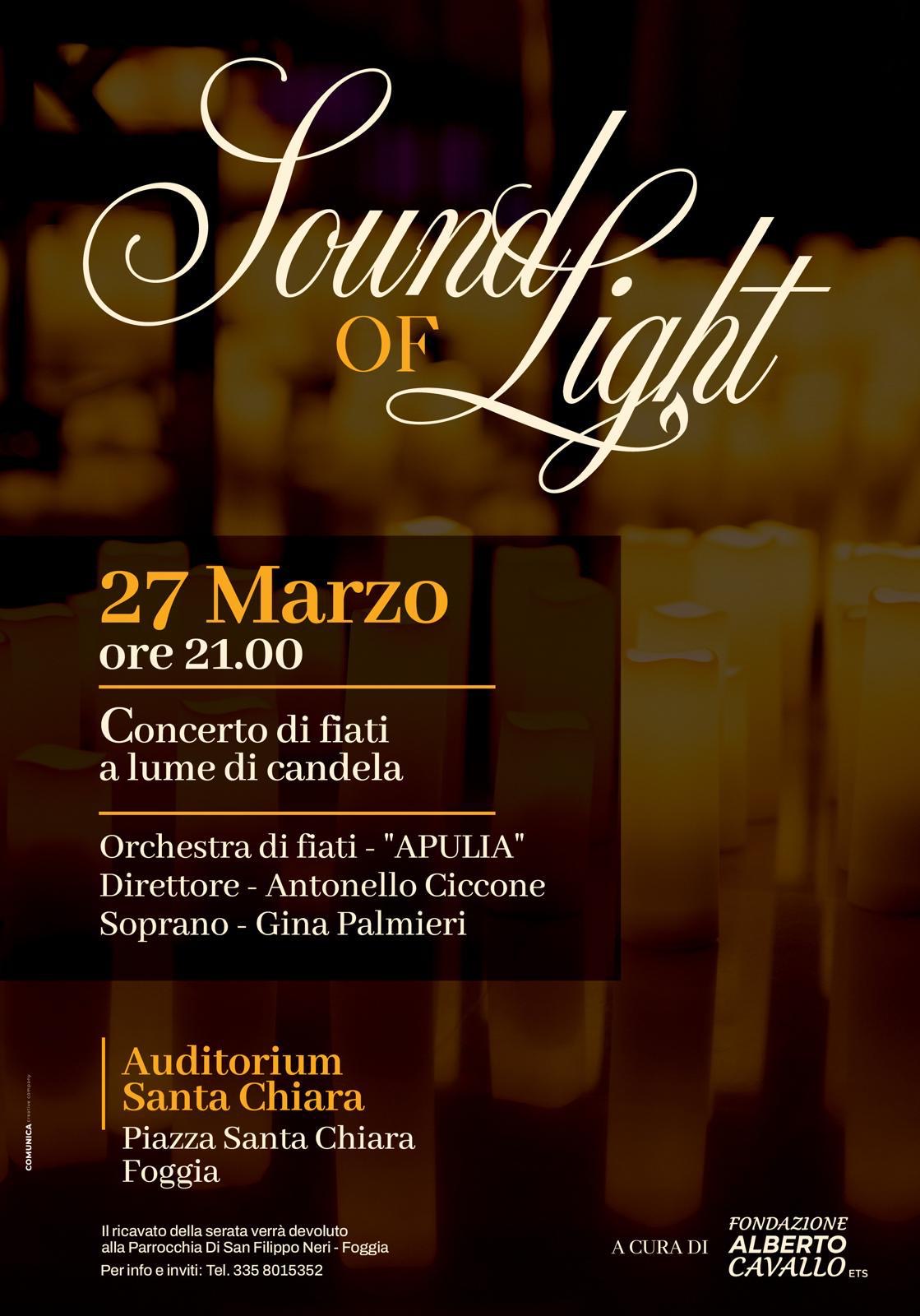 Un'atmosfera intima, il calore di centinaia di candele e l'eleganza della musica per fiati: questi gli ingredienti di "Sound of Light", l'evento concertistico che si terrà il prossimo 27 marzo alle ore 21 presso l'Auditorium Santa Chiara di Foggia (Piazza Santa Chiara). L'iniziativa, curata dalla Fondazione Alberto Cavallo ETS, promette di trasportare il pubblico in un viaggio sensoriale unico.