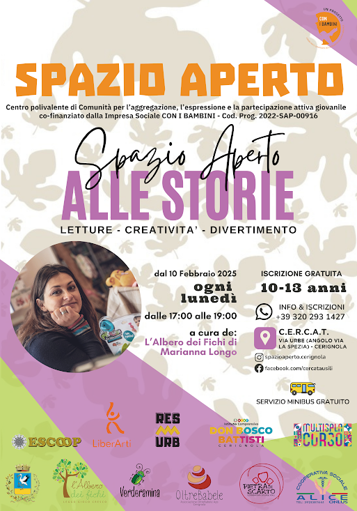 Il nuovo anno chiama nuove iniziative in quel del Cercat di Cerignola: sono aperte le iscrizioni per il laboratorio di lettura creativa, dal titolo “Spazio Aperto Alle Storie – letture, creatività, divertimento”, a cura della libraia Marianna Longo de L’Albero dei Fichi, libreria specializzata in libri per bambini e ragazzi.