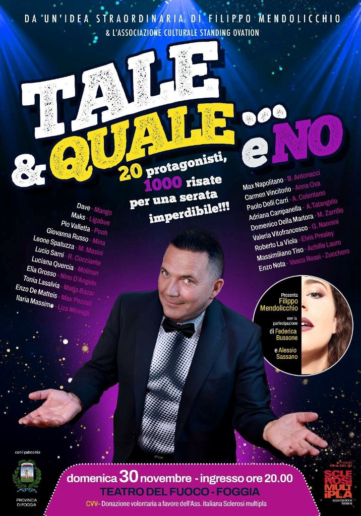 Domenica 30 novembre 2025 al Teatro del Fuoco di Foggia ci sarò l’evento “Tale & Quale… e No”, spettacolo ideato da Filippo Mendolicchio e dall’Associazione Standing Ovation.