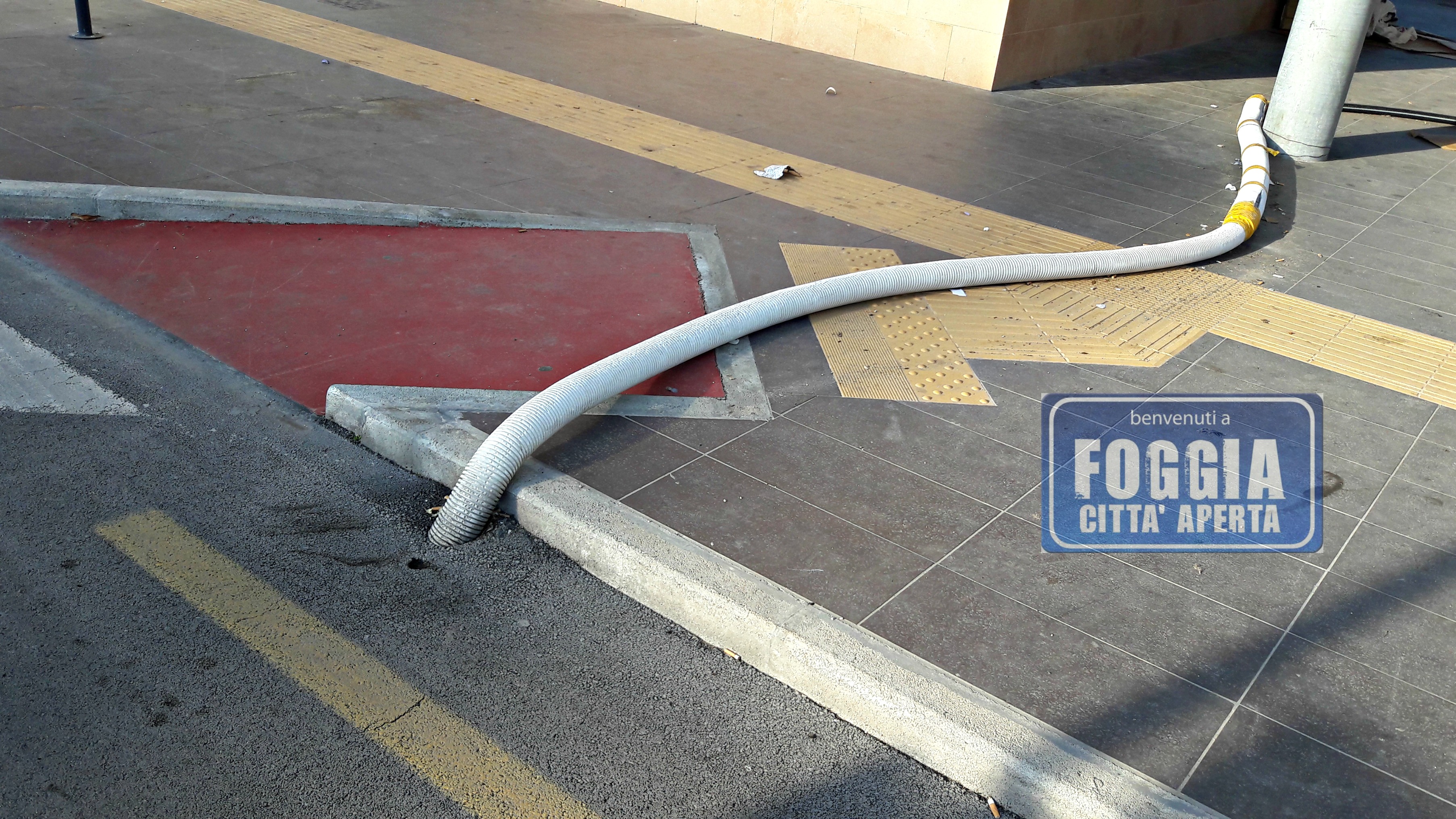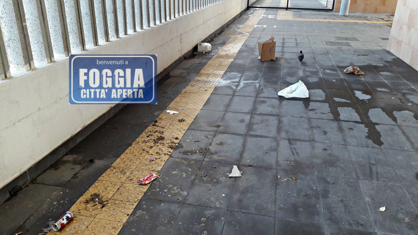Piccoli laghi maleodoranti sparsi in varie zone della struttura; un locale, la cui destinazione è poco chiara, trasformato in una vera e propria latrina. Dappertutto, resti di bivacchi improvvisati, rifiuti e cartoni. Come se non bastasse poi, un tubo misterioso che fuoriesce da un locale e termina direttamente nel sottosuolo 'bucando' l'asfalto. A pochi mesi dall'inaugurazione, l'area del Nodo Intermodale di Foggia rischia di trasformarsi in un luogo abbandonato alla sporcizia.