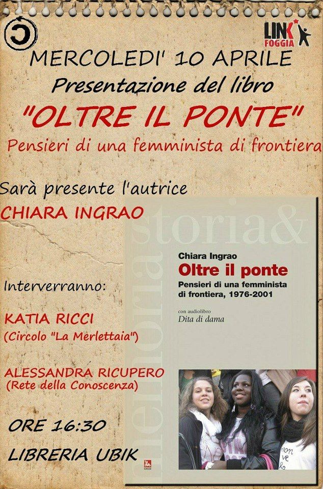 Il femminismo, i diritti dei lavoratori, i conflitti, la diversità. Sono solo alcuni degli spunti in programma mercoledì 10 aprile, a partire dalle ore 16.30, dallo spazio live della libreria Ubik, per un incontro organizzato dal Link Foggia. Protagonista della serata, Chiara Ingrao, autrice del libro “Oltre il Ponte. Pensieri di una femminista di frontiera”. Il dibattito sarà animato dagli interventi di Alessandra Ricupero, Responsabile nazionale area tematica "Genere" della Rete della Conoscenza, e di Katia Ricci del Circolo "La merlettaia". Modera, Regina Barile (Link).
