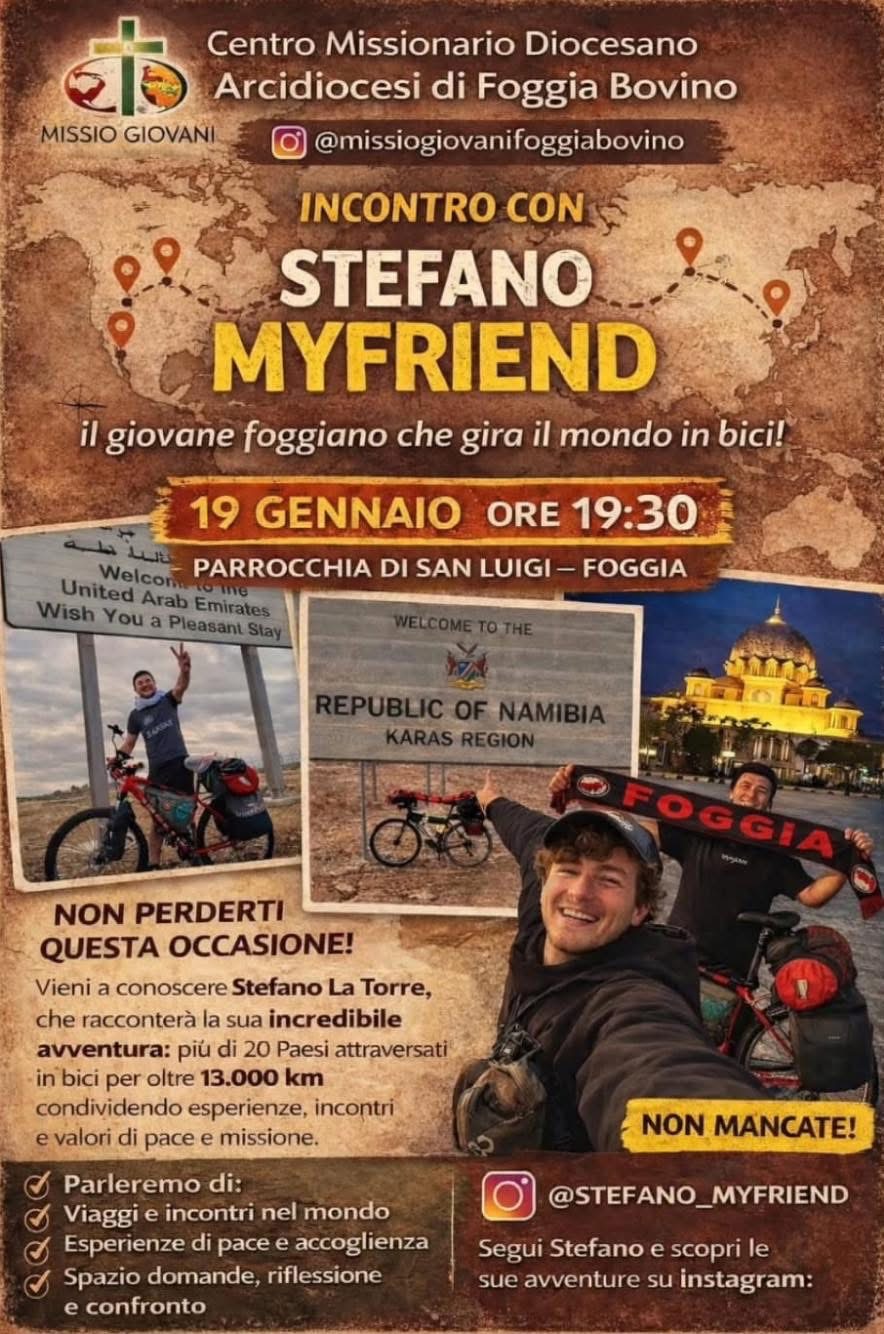 L'occasione per conoscere Stefano La Torre e la sua incredibile avventura: più di 20 Paesi attraversati in bici per oltre 13mila km, condividendo esperienze, incontri, valori di pace e missione. Lunedì 19 gennaio alle 19:30, presso la parrocchia San Luigi di Foggia (in via Pietro Scrocco 1), è in programma l'appuntamento con Stefano MyFriend, il "giovane foggiano che gira il mondo in bici".