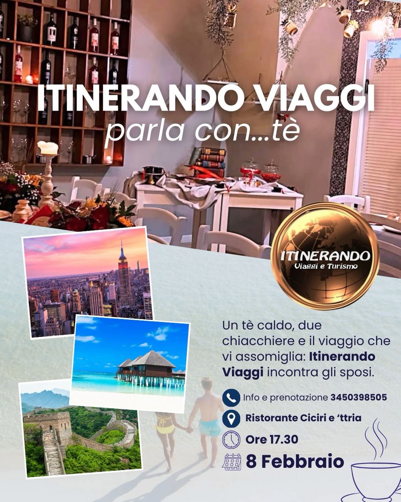 Raccontare la propria storia, i sogni e come si immagina il primo itinerario da sposati. Perché "il viaggio più importante inizia sempre da una conversazione". Ne sono convinti all’agenzia ltinerando viaggi, che lancia un'iniziativa originale: domenica 8 febbraio (ore 17:30) presso il Ristorante Ciciri e ’ttria (corso Vittorio Emanuele II, 124) è in programma "Itinerando parla con... tè".