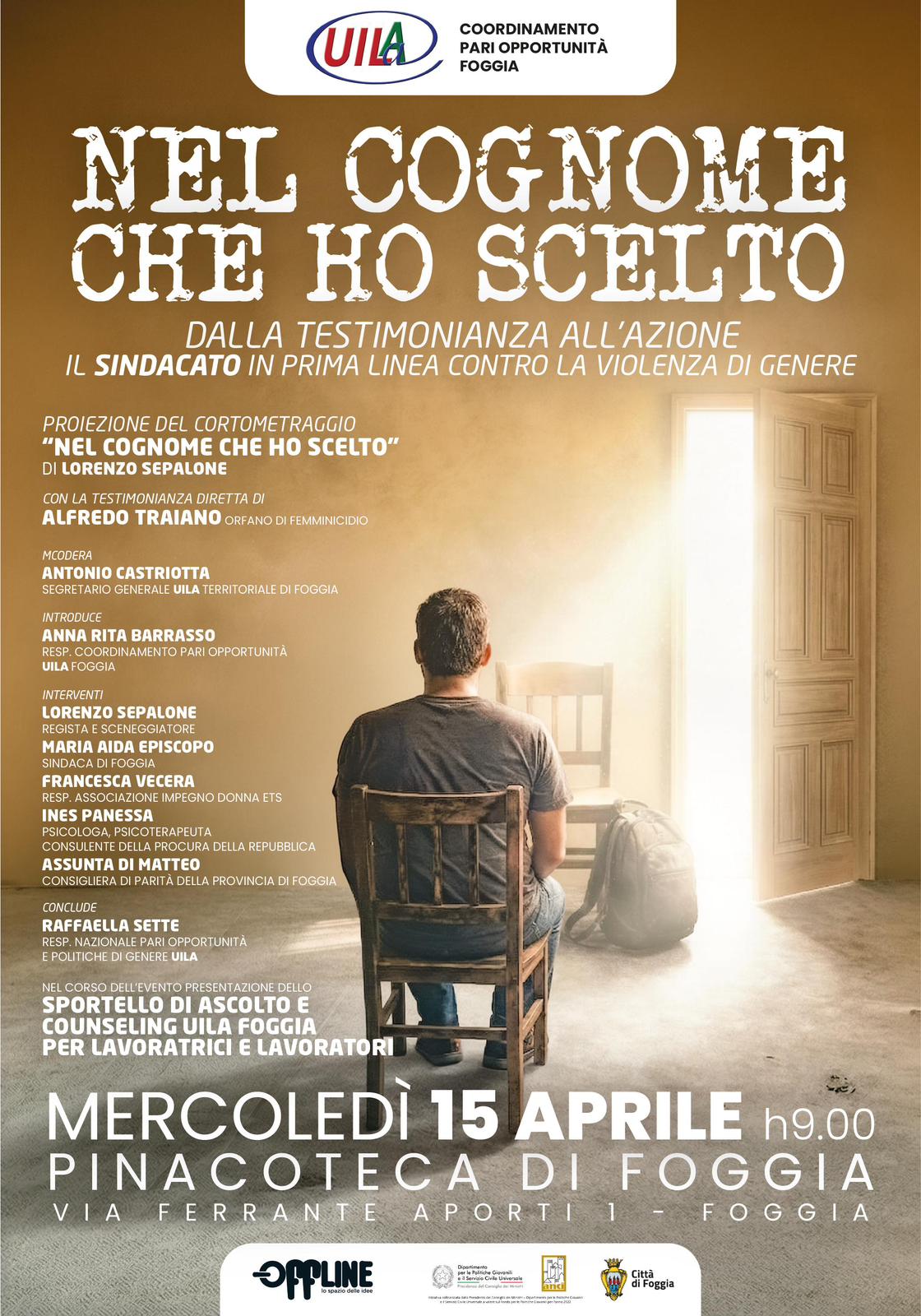 Si terrà mercoledì 15 aprile, alle ore 9, presso la civica Pinacoteca Il 9Cento di Foggia (via Ferrante Aporti) il convegno dal titolo “Nel cognome che ho scelto” – Dalla testimonianza all’azione: il sindacato in prima linea contro la violenza di genere, promosso dal Coordinamento Pari Opportunità UILA Foggia. L’iniziativa rappresenta un importante momento di riflessione e sensibilizzazione su un tema di grande rilevanza sociale, con l’obiettivo di promuovere un confronto concreto tra istituzioni, sindacato e realtà del territorio impegnate nella prevenzione e nel contrasto alla violenza di genere. Durante la mattinata sarà proiettato il cortometraggio “Nel cognome che ho scelto”, diretto da Lorenzo Sepalone, regista e sceneggiatore, cui farà seguito la testimonianza di Alfredo Traiano, orfano di femminicidio, che offrirà un contributo diretto e di forte impatto umano al dibattito.