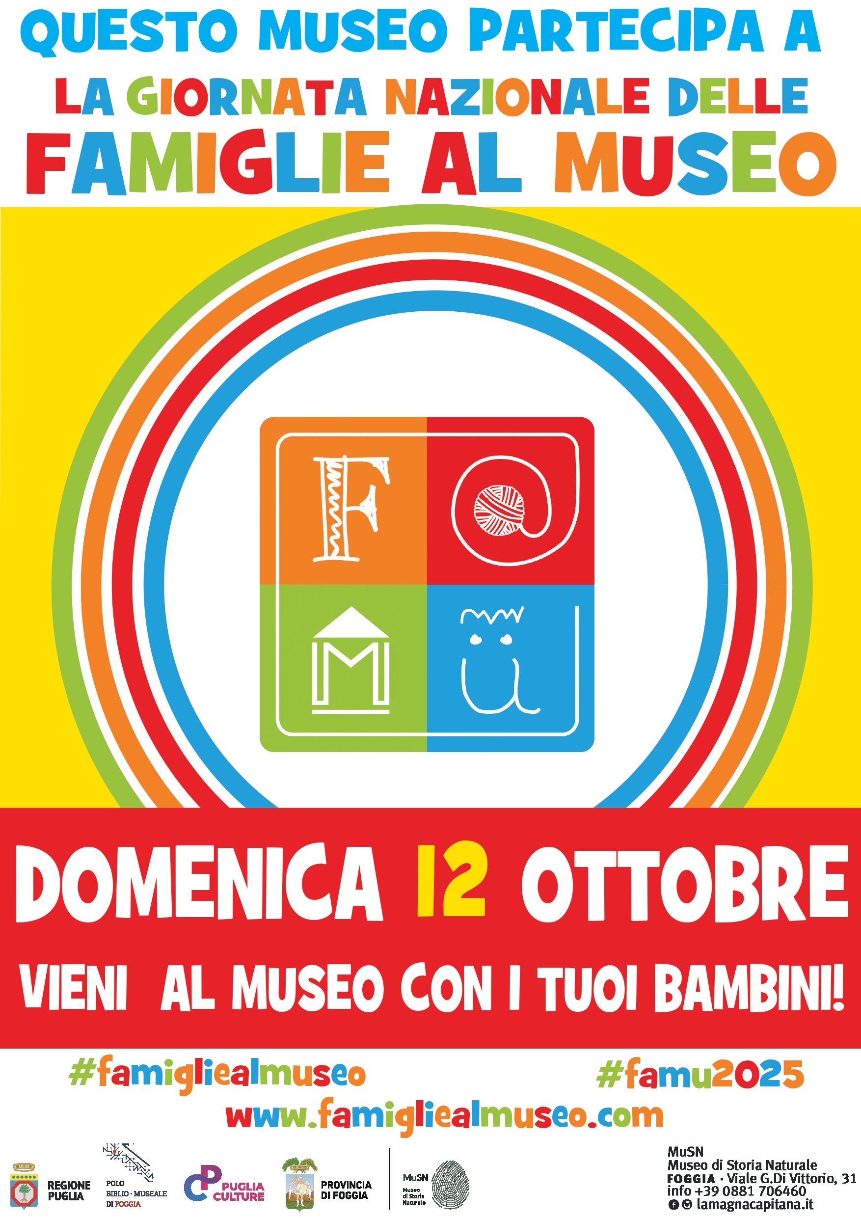 L'INIZIATIVA. Con quest'attività il Polo Biblio-Museale di Foggia, anche quest'anno, aderisce alla Giornata Nazionale delle Famiglie al Museo (F@Mu), organizzata sin dal 2013 dall'Associazione Famiglie al Museo, per creare occasioni di fruizione familiare nei luoghi espositivi. Un'occasione, dunque, per tutta la famiglia, per visitare le sale espositive del Museo e le sue ricche collezioni. Info: 0881/706460 e museodistorianaturale.foggia@regione.puglia.it.