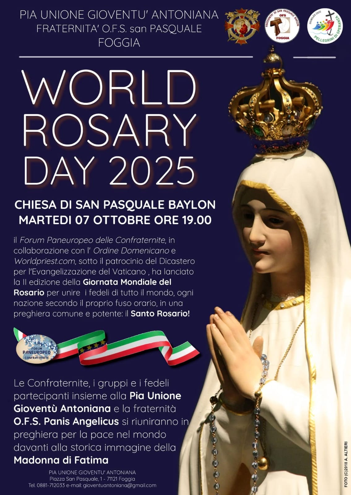 L'APPUNTAMENTO. Il Forum Paneuropeo delle Confraternite, in collaborazione con l'Ordine Domenicano e Worldpriest.com, sotto il patrocinio del Dicastero per l'evangelizzazione del Vaticano, ha lanciato infatti la seconda edizione della Giornata mondiale del Rosario, per unire i fedeli di tutto il mondo in una preghiera comune. A Foggia, pertanto, le Confraternite, i gruppi, i fedeli partecipanti insieme alla Pia Unione Gioventù Antoniana e la fraternità O.F.S. Panis Angelicus, si riunirano nella chiesa in piazza San Pasquale.