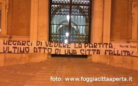 Intorno alle 19, seguendo l'appello lanciato dagli Ultras dell Curva Nord, un centinaio di tifosi si è ritrovato davanti al Palazzo di Città. Sull'entrata principale è stato apposto lo striscione che vedete in foto, mentre i tifosi intonavano cori contro il Sindaco Gianni Mongelli.